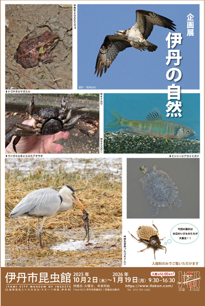 企画展「伊丹の自然」は2025年10月2日〜2026年1月19日の期間(年末年始、休館日を除く)、伊丹市昆虫館2階第二展示室にて開催中です。