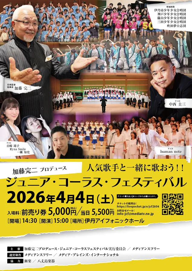 2026年4月4日(土)、伊丹アイフォニックホールメインホールにて、音楽監督・加藤完二氏プロデュースによる「ジュニア・コーラス・フェスティバル」が開催されます。
