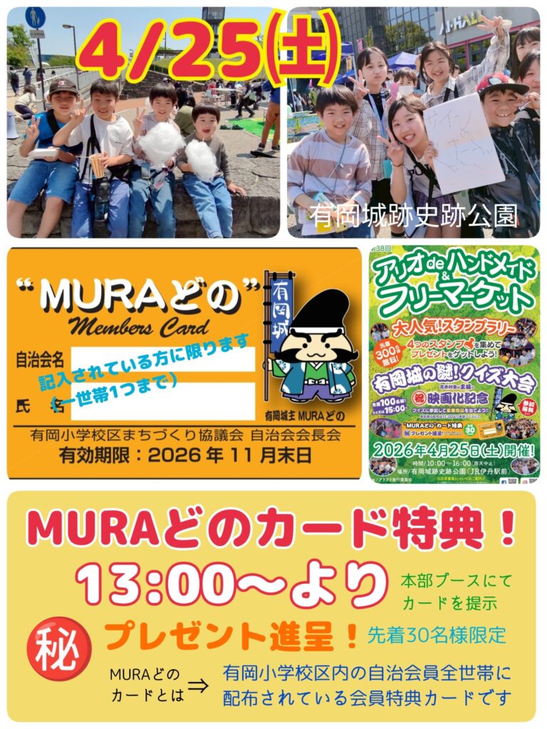 また、今回は有岡小学校地区自治会員全世帯に配布された「MURAどのカード」13:00に本部ブースに持参すると先着30名にプレゼントがもらえます。