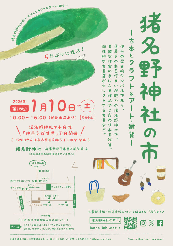 新型コロナウイルスの影響により2020年3月の開催中止以降、長らく休止していた「猪名野神社の市ー古本とクラフト&アート・雑貨ー」が、2026年1月10日(土)、ついに5年ぶりの復活を果たします!