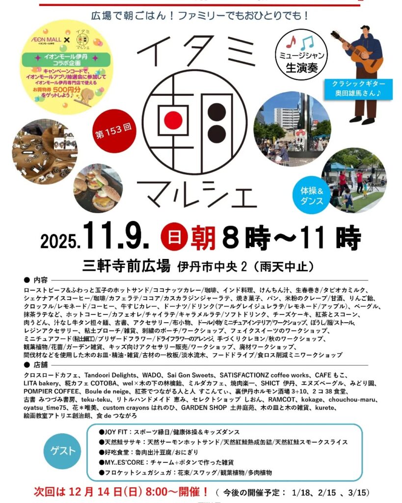 毎月一度、日曜日の朝に開催されている「イタミ朝マルシェ」、11月は9日(日)に開催されます。
