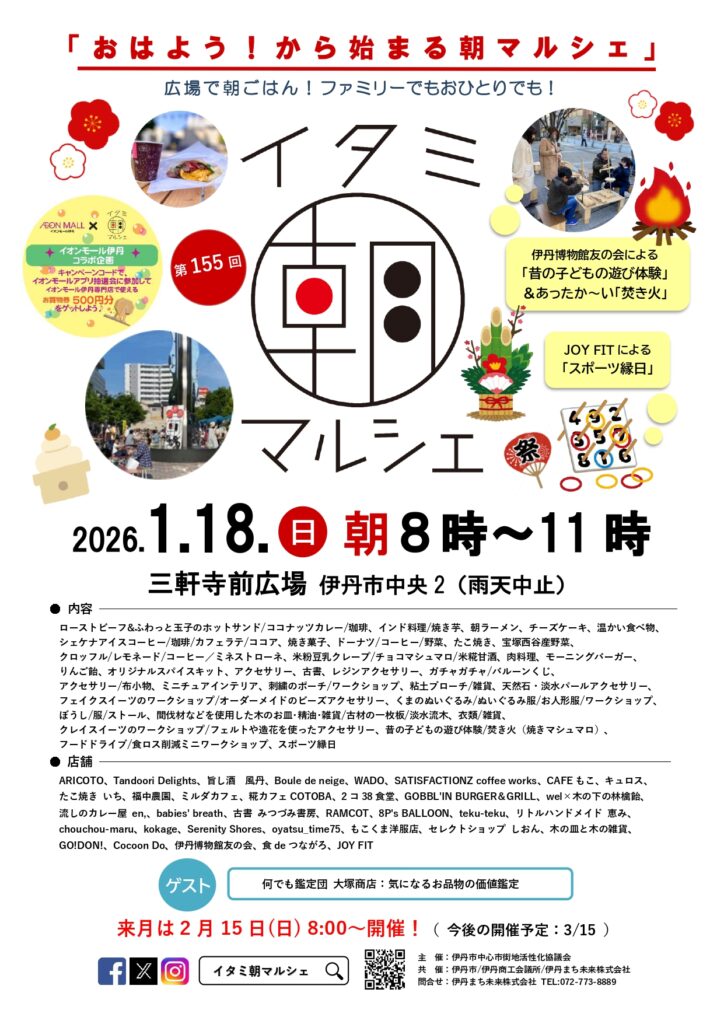 毎月一度、日曜日の朝に開催されている「イタミ朝マルシェ」、1月は18日(日)に開催されます。