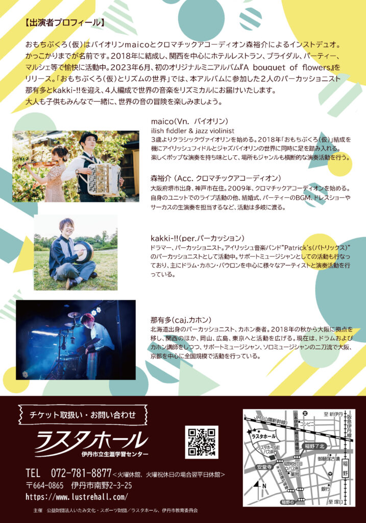 演奏は伊丹のいろんなイベントでお馴染みのメンバーの皆さんで構成される「おもちぶくろ(仮)」です。