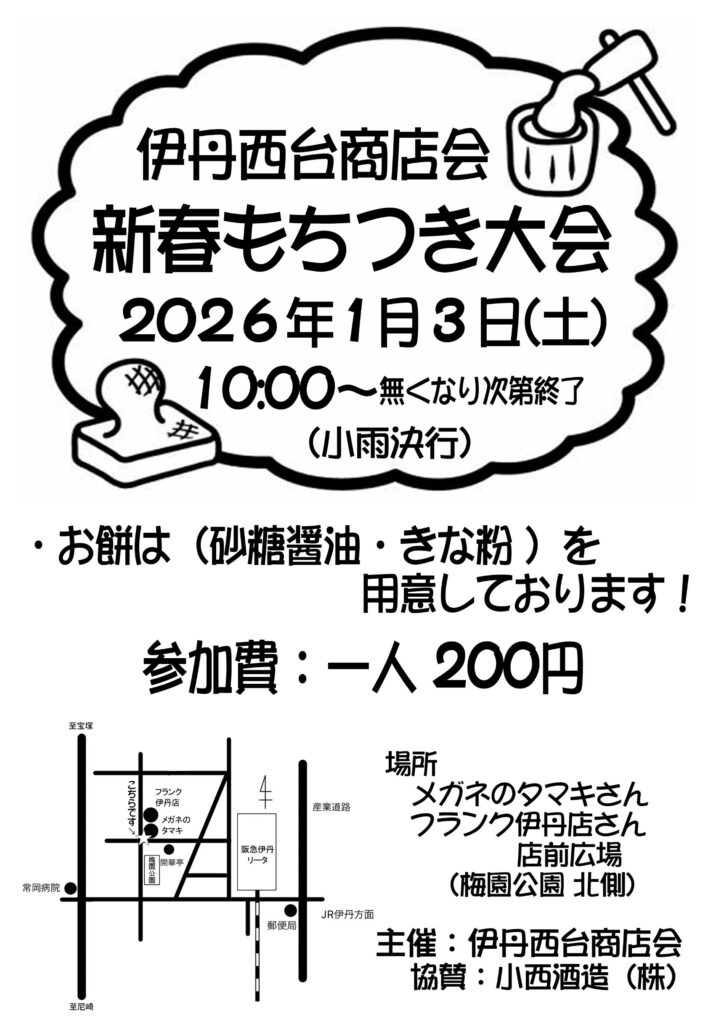 地域のみなさんがファミリーで参加できる楽しいイベントを開催している伊丹西台商店会が、2026年も1月3日(土)に恒例の「新春もちつき大会」を開催します!