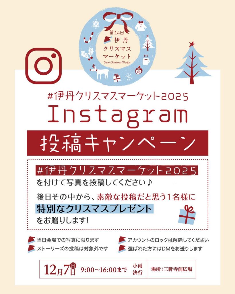 ハッシュタグ「#伊丹クリスマスマーケット2024」をつけて写真を投稿すると、後日、その中から素敵な投稿だと思う1名に、特別なクリスマスプレゼントが贈られるというもの!