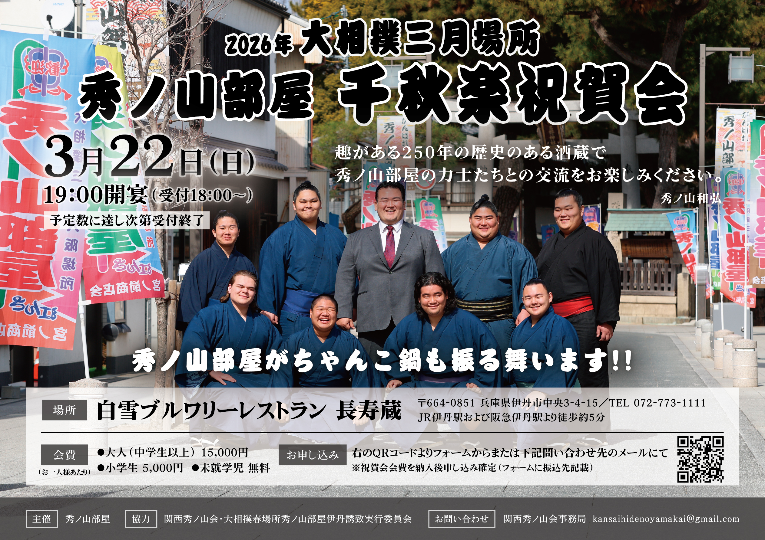 3月22日(日) 2026年大相撲三月場所 秀ノ山部屋千秋楽祝賀会開催! 白雪ブルワリーレストラン長寿蔵