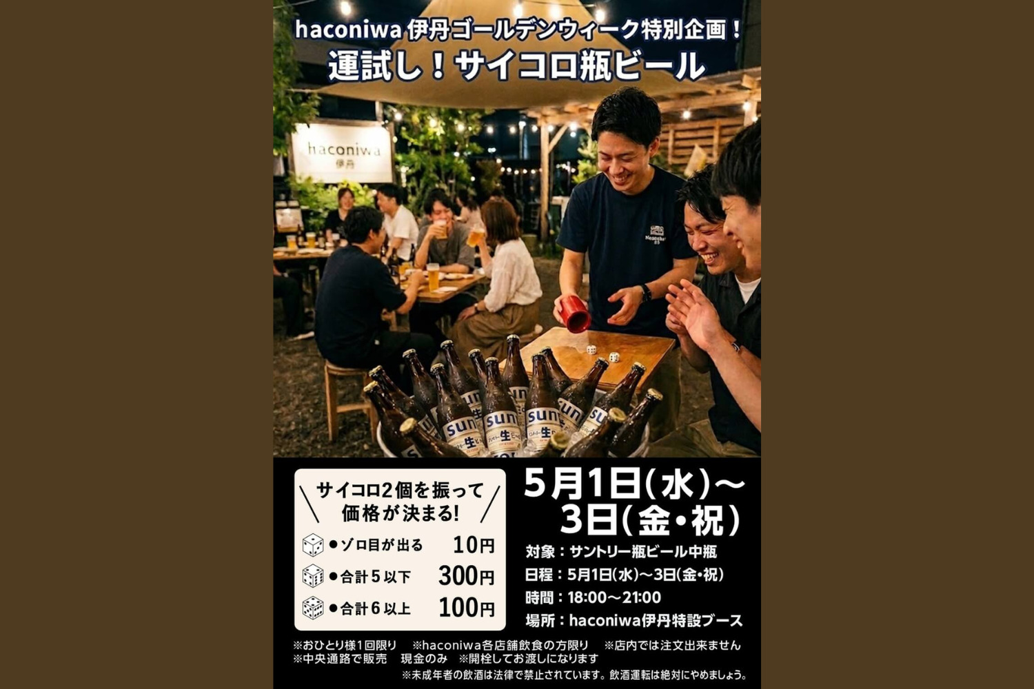 5月1日〜3日 阪急伊丹駅前のハコニワ伊丹でGW限定の「運試し」!ゾロ目が出たら、瓶ビールがまさかの10円に